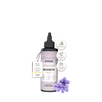 Eine Sprühflasche mit der Aufschrift "ALPHAZOO Force Bye Bye Vloh" für Flohabwehr, mit einer Illustration von Hund und Katze und natürlichen Ölen.
