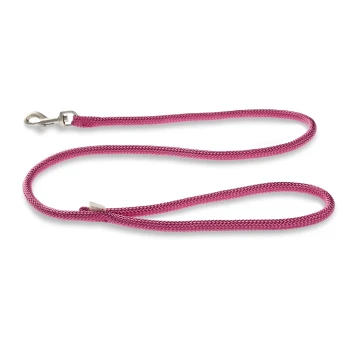 Weiße Hundeleine mit einem Metallclip, ordentlich auf einem weißen Hintergrund aufgerollt.