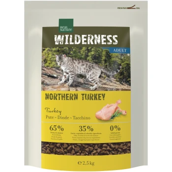 2,5 kg Beutel von Real Nature Wilderness Katzenfutter, "Ranger's Forest," mit Tabby-Katzen-Design, das 70% Fleisch und 0% Getreide enthält.