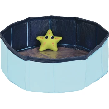 Ein buntes Hundespielzeug aus gedrehtem Seil in marineblau, grau und weiß, geformt wie ein Ball.