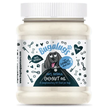 Ein Behälter mit Premiere-Hundetopping-Pulver, auf dem ein lächelnder Hund abgebildet ist. Das Etikett lautet "Hühnermagen mit Kokosnuss" und "100g."