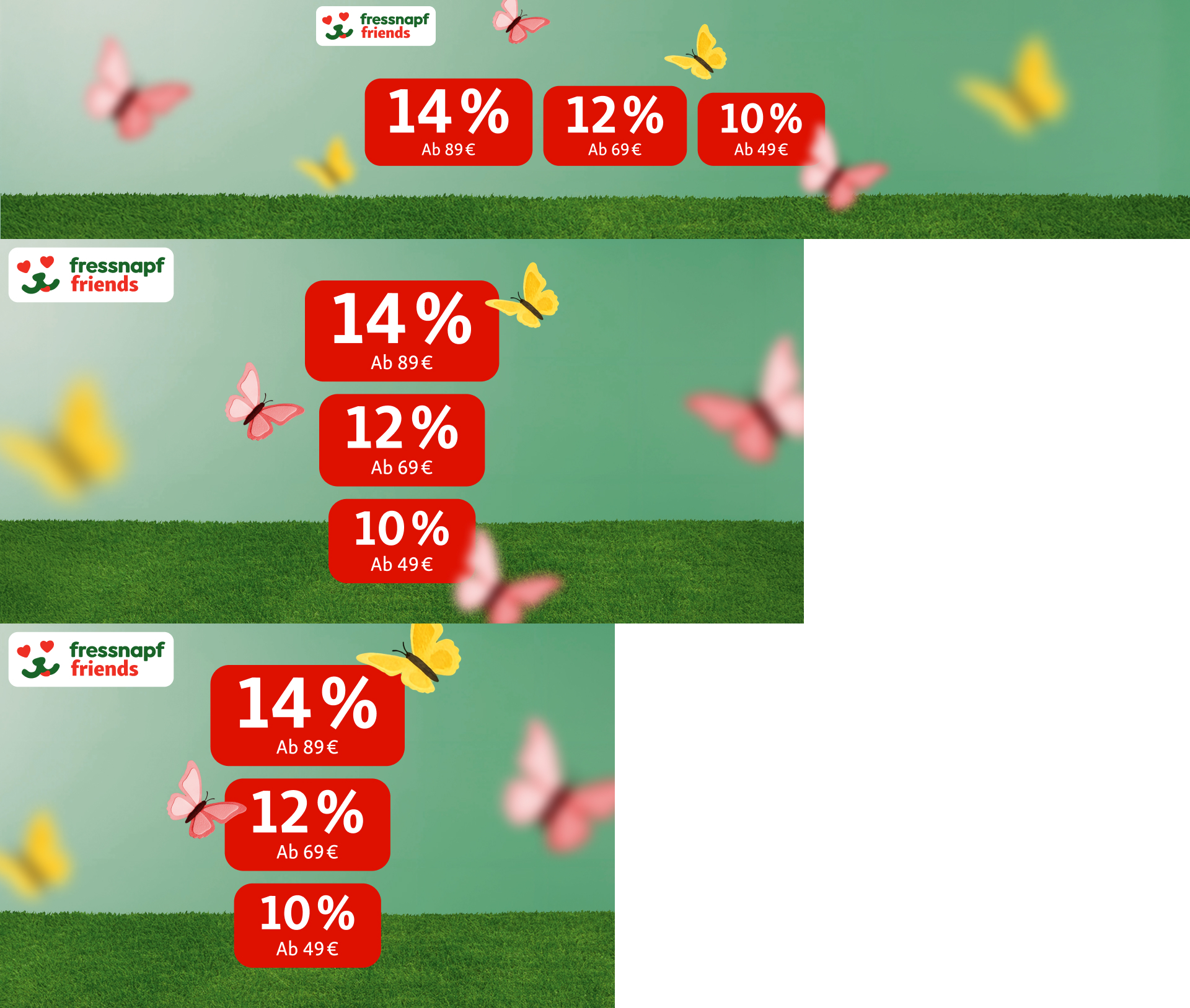**Angebot der Fressnapf Tiernahrungs GmbH, Westpreußenstraße 32-38, 47809 Krefeld, für den Fressnapf Onlineshop, für die Fressnapf-Märkte der mit ihr verbundenen Unternehmen sowie für die von selbstständigen Fressnapf-Partnern betriebenen Fressnapf-Märkte, soweit sie am Fressnapf Friends Programm teilnehmen. Der Rabatt gilt auf den gesamten Einkauf: 10% ab 49€, 12% ab 69€ und 14% ab 89€. Gültig vom 10.04.2026 bis 12.04.2026. Im Markt setzt die Einlösung der Coupons die Benutzung der Fressnapf App und die Teilnahme bei Fressnapf Friends voraus. Die Coupons sind nur einmal pro Person einlösbar. Sofern nicht anders angegeben, sind die beworbenen Angebote nicht mit anderen Angeboten (insb. Preisreduzierungen und Coupons) kombinierbar. Mehr Infos und Teilnahmebedingungen für Fressnapf Friends finden sich auf fressnapf.de/friends. Ausgenommen sind Tiere, Bücher, Zeitschriften, Gutscheine, Versandkosten, Pfand, Tabak, Reisen, Salonleistungen, Leistungen von Versicherungspartnern und Activet Tierarztpraxen sowie Produkte und Dienstleistungen, bei denen ein Teil des Preises gespendet wird. Ausgeschlossen sind einige Artikel unserer Marktplatzpartner, weiter Informationen unter www.fressnapf.de/aktionen-angebote/fruehlingsrabatt/