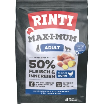 Rinti Max-I-Mum Hundefutter für große Rassen, 4 kg Beutel, mit 50% Fleisch und Innereien, mit frischem Huhn, getreidefreier Rezeptur und 50% Gemüse.