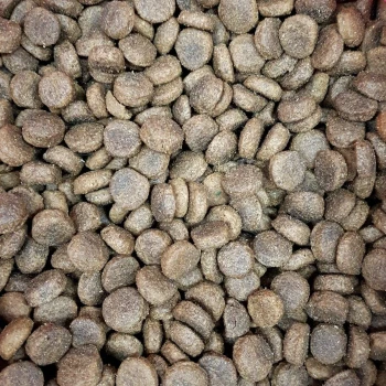 Hundefuttertüte mit der Aufschrift "Dr. John Titanium" mit einer Illustration eines laufenden Hundes, reich an Huhn und Gemüse, 25% Protein, 15% Fett, 15 kg.