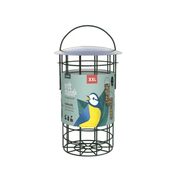 Ein grüner Vogelfutterspender mit einem transparenten Rohr und einer XL-Futterplatte, begleitet von einem bunten Kohlmeisenvogel an der Basis.