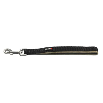 Schwarze verstellbare Hundeleine mit Metallclips und Ringen, beschriftet mit "Wolters".