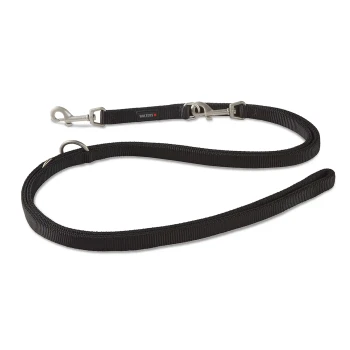 Schwarze verstellbare Haustierleine mit zwei Metallclips und einem zentralen Ring zur Befestigung.