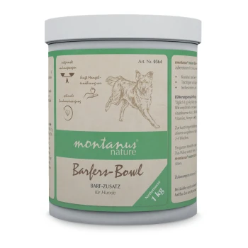 Behälter mit Fluffy-Coat montanus Natur, einem Haut- und Fellpulver für Hunde, mit einem gelben Etikett und Nährwertinformationen.