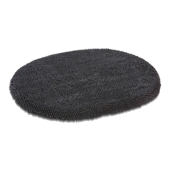 Graue Haustiermatte mit einem gesteppten Design, das schwarze Diamantmuster und eine gefaltete Kante zeigt, mit einem Etikett mit Informationen zur Haustierpflege.