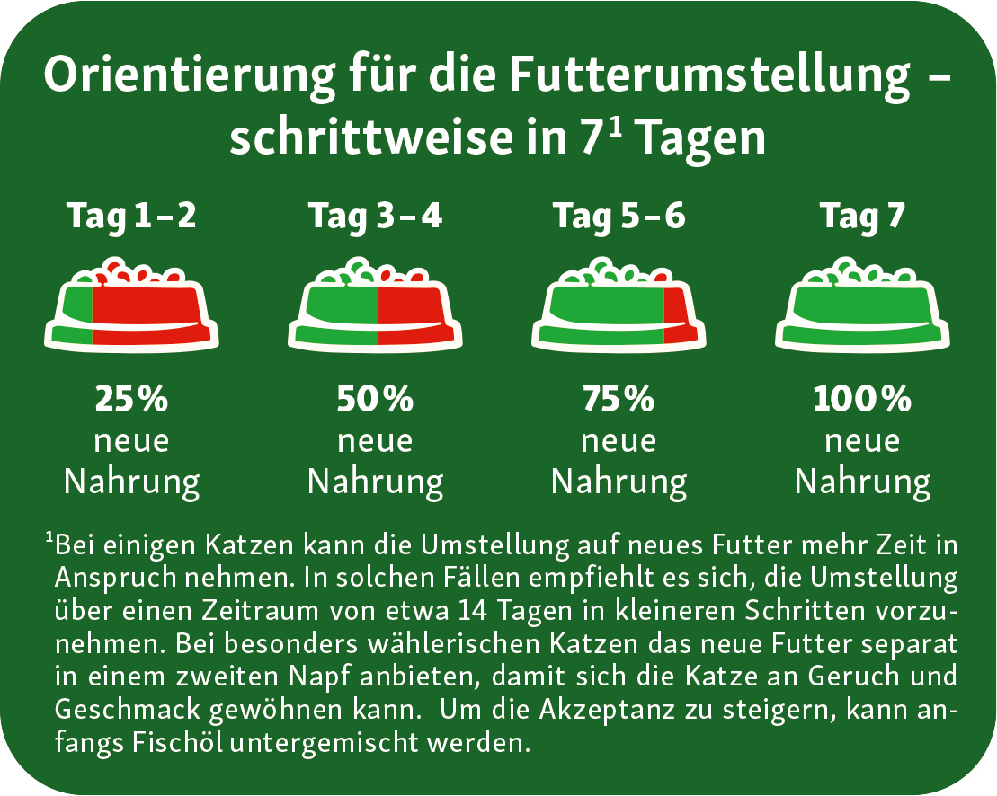 - Während der Fütterung eines veterinärmedizinischen Diätfutters sollte mindestens alle 6 Monate ein Tierarzt zur Kontrolle aufgesucht werden.