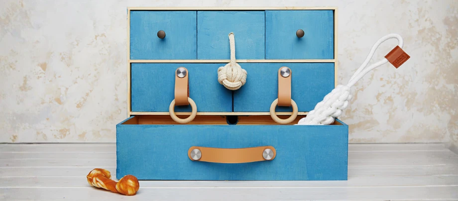 Mit wenigen Handgriffen kannst du ein selbst gestaltetes, dekoratives Trickspielzeug für deinen Hund basteln. Eine gebrauchte oder neue Minikommode kannst du im Handumdrehen in ein Intelligenzspielzeug für deinen Hund verwandeln und darin natürlich auch Dinge aufbewahren. Je nachdem, wie groß und geschickt dein Liebling ist, kannst du verschiedene Griffe (die es ihm leichter oder schwerer machen) anbringen. In den Fächern versteckst du sein Lieblingsspielzeug oder Leckerli – dein Hund wird schnell lernen, die Schubladen zu öffnen. Bedenke aber: Beherrscht er diesen Trick, kann er ihn auch bei anderen Schubladen anwenden.