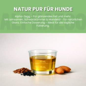 Das Alpha-Zegg Futteröl für Hunde ist ein hochwertiges Ergänzungsfuttermittel zur täglichen Fütterung. Die Kombination aus Leinöl, Schwarzkümmelöl und Mandelöl liefert wertvolle Omega-3-, Omega-6- und Omega-9-Fettsäuren und ergänzt die Mahlzeit deines Hundes auf natürliche Weise. Das Futteröl eignet sich ideal als BARF Öl für Hunde sowie als Ergänzung zu Nass- und Trockenfutter.