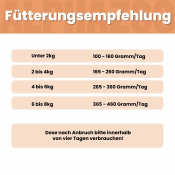 Wie bei allen alphazoo-Produkten verzichten wir bewusst auf Getreide, Zucker, künstliche Zusätze und Konservierungsstoffe. Unser Nassfutter wird in Deutschland hergestellt und besonders schonend verarbeitet, um Geschmack, Vitamine und Nährstoffe bestmöglich zu bewahren.