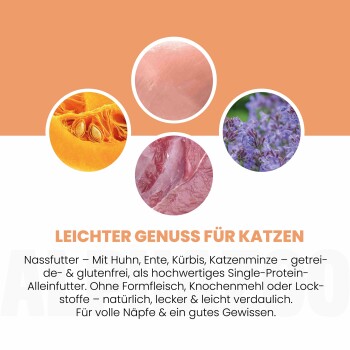Mit alphazoo Duoprotein Ente + Huhn gibst du deiner Katze eine natürliche, ausgewogene Mahlzeit – voller Liebe, Qualität und Genuss.