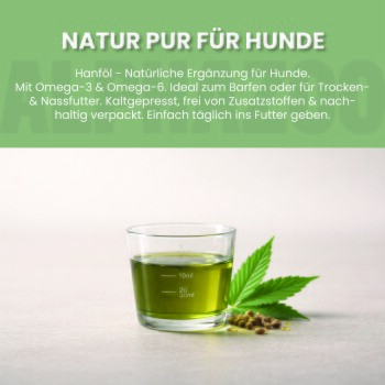 Das Hanföl für Hunde ist ein hochwertiges Ergänzungsfuttermittel zur täglichen Fütterung. Es wird aus den Samen der Hanfpflanze gewonnen und liefert wertvolle Omega-3-, Omega-6- und Omega-9-Fettsäuren, die Hunde nicht selbst herstellen können.