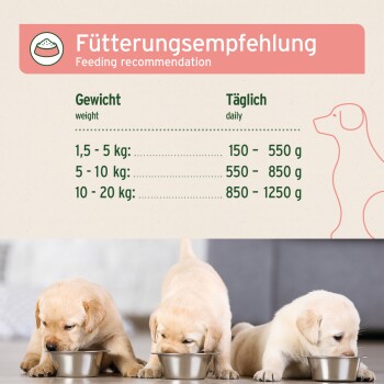 Hinweis: Bitte verteile die Futtermenge in Höhe von 5 % - 8 % des Körpergewichts täglich auf 3 – 5 gleiche Mahlzeiten. Die Anzahl der täglichen Mahlzeiten wird mit zunehmendem Alter angeglichen. Bitte immer zimmerwarm füttern und nach dem Öffnen im Kühlschrank aufbewahren. Angaben sind Richtwerte. Die Fütterung sollte an die Bedürfnisse (Aktivität, Alter, Rasse, Größe und Gesundheit) des Tieres angepasst werden. Bitte stelle immer ausreichend Trinkwasser bereit.