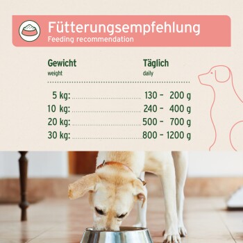Hinweis: Bitte immer zimmerwarm füttern und nach dem Öffnen im Kühlschrank aufbewahren. Angaben sind Richtwerte. Die Fütterung muss an die Bedürfnisse (Aktivität, Alter, Rasse, Größe und Gesundheit) des Tieres angepasst werden. Bitte stelle immer ausreichend Trinkwasser bereit.