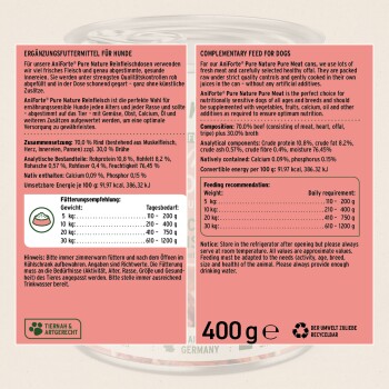 AniForte PureNature Nassfutter ist ein High Quality Single-Protein Futter für Hunde in Super-Premium-Qualität - hergestellt in Deutschland nach Lebensmittelstandard. Das Geheimnis unserer Qualität ist das viele frische und hochwertige Fleisch, das wir für AniForte PureNature verwenden. Die hohe Qualität unserer Zutaten nehmen wir genauestens unter die Lupe und unterziehen sie regelmäßigen veterinärmedizinischen Kontrollen! Doch allein die Kontrolle ist nicht die einzige Garantie für unseren hohen Qualitätsanspruch: Wir beziehen das Fleisch fast ausschließlich von Erzeugern, mit denen wir schon seit Jahren vertrauensvoll zusammenarbeiten. Die Zutaten werden so schnell wie möglich verarbeitet, um ihre Frische und die natürlichen Vitamine zu erhalten. Alle wertvollen Inhaltsstoffe bleiben auf diese Weise nahezu vollständig erhalten - so stellen wir eine gute Ernährung sicher und schmecken tut´s auch noch besonders gut.