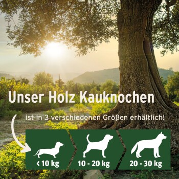 Zur Beschäftigung nach den Mahlzeiten oder bei Bedarf zwischendurch. Durch seine Beschaffenheit saugt das Olivenholz kein Wasser auf und eignet sich daher auch sehr gut für Apportier-Spiele. Bitte stelle Deinem Hund immer ausreichend frisches Wasser zur Verfügung und lasse ihn nicht unbeaufsichtigt beim Kauen oder Spielen.