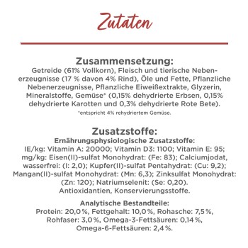 Fettgehalt 10 %, Omega-6- Fettsäuren 2,3 %, Omega-3-Fettsäuren 0,1 %, Protein 20 %, Rohasche 8 %, Rohfaser 3 %