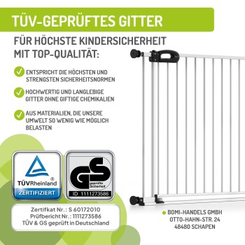 BOMI "Merle FlatStep" Tierschutzgitter bietet Ihnen und Ihren pelzigen Familienmitgliedern maximale Sicherheit. Es ist nach DIN EN 1930:2012 geprüft und ein selbstschließendes Tür- und Treppenschutzgitter, dem Sie vertrauen können