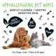 - Praktisch für unterwegs Mit einer Größe von 20 cm x 20 cm sind die Tücher ideal für die schnelle Reinigung von Körper, Pfoten, Po und Augen deines Haustiers – ganz ohne Wasser. Perfekt für Reisen, Spaziergänge oder als Ergänzung zur täglichen Pflege