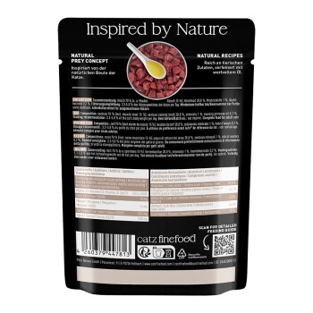 Catz finefood Purrrr's Zutatenliste ist wohl durchdacht und bewußt kurz gehalten: Fleisch und katzengerechte Innereien, Kochbrühe, Mineralstoffe und ein hochwertiges Öl. Damit ist es besonders bekömmlich und sehr gut verdaulich, auch für alle Katzen die an einer Futtermittelallergie oder einem sensiblen Verdauungssytem leiden.