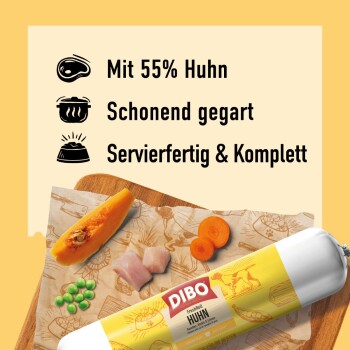 Die DIBO FreshRoll Huhn ist ein hochwertiges und besonders leicht verdauliches Alleinfuttermittel für Hunde. Dieses sorgfältig schonend gegarte Menü wird tiefgekühlt in der praktischen 800-g-Wurstform geliefert. Als Monoprotein-Menü (nur Huhn) ist es ideal für sensible Hunde oder als Teil einer Ausschlussdiät. Nach dem Auftauen ist die FreshRoll einfach zu portionieren und sofort fütterungsbereit.