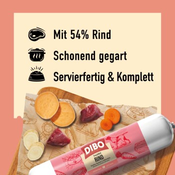 Die DIBO FreshRoll Rind ist ein hochwertiges und bekömmliches Alleinfuttermittel für Ihren Hund, das Frische und Komfort perfekt vereint. Dieses sorgfältig schonend gegarte Menü wird in einer praktischen, tiefgekühlten 800-g-Wurstform geliefert. Es ist die ideale Lösung für alle, die eine natürliche und ausgewogene Fütterung ohne großen Aufwand wünschen – einfach auftauen lassen, portionieren und füttern.