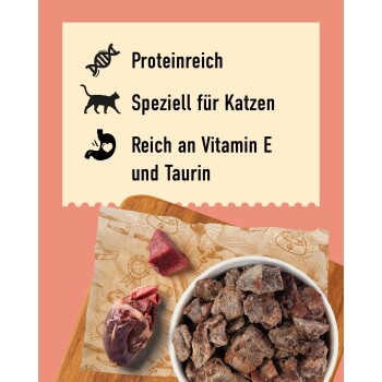 - Proteinreiches, mageres Rindfleisch & entfettetes Rinderherz – besonders für übergewichtige Katzen geeignet
