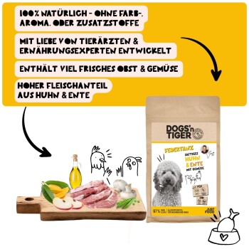 Dein Hund liebt es knusprig. Du liebst gute Zutaten? Dann ist Federtanz euer perfektes Match. Unser Premium-Trockenfutter kombiniert 67 % frisches Huhn & Ente für extra Protein – und eine Portion Geschmack, die selbst wählerische Doggos überzeugt.