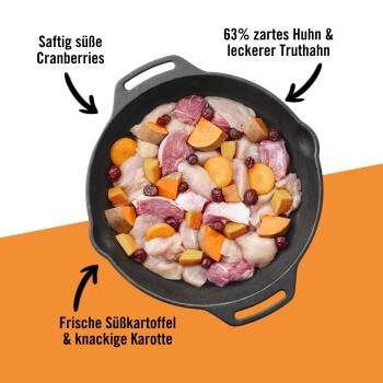 - Hochwertiges und Getreidefreies Hunde Nassfutter mit einem Fleischanteil an 63% frischem Huhn & Truthahn
