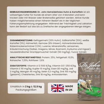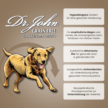 Dr John GRAIN FREE Chicken & Potato ist ein komplettes, getreidefreies und hypoallergenes Hundefutter, das für erwachsene Hunde aller Rassen und Altersgruppen ab einem Alter von 4 Monaten geeignet ist.