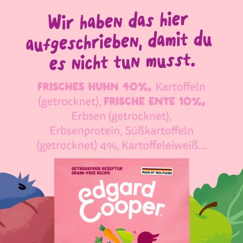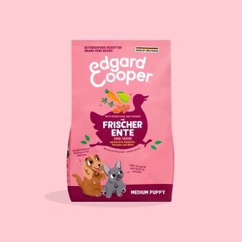 Reich an frischer Ente und Huhn aus Freilaufhaltung, ist diese getreidefreie Spezialität perfekt auf die Bedürfnisse von Welpen ausgerichtet. Es ist voll an hochwertigem, kalorienarmen Protein - das bedeutet kein getrocknetes oder entwässertes Fleisch. Dieses Futter enthält Präbiotika für einen gesunden Darm und wir fügen natürliche Extrakte von Glucosamin und Chondroitin für starke Gelenke hinzu. Edgard & Cooper bereiten ihre Trockenfutter mit einem super gesunden Mix aus Obst und Gemüse sowie einer extra Portion gesunder Kräuter zu. Dann wird es schonend gegart, um all das Gute und den Geschmack zu erhalten.