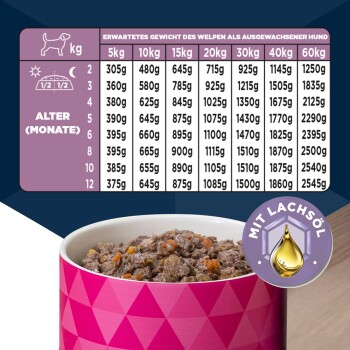 Bei den folgenden Angaben handelt es sich um Richtwerte, die von den tatsächlich benötigten Futtermengen abweichen können. Bitte passe die Futtermenge so an, dass der Hund sein ideales Körpergewicht beibehält. Erwartetes Gewicht des Welpen als ausgewachsener Hund und tägliche Futtermenge in Gramm/Tag.