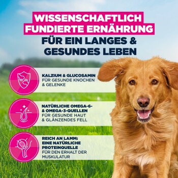 Natürliche Omega-6- und Omega-3-Fettsäuren sorgen für gesunde Haut und glänzendes Fell. Antioxidantien wie Vitamin E unterstützen das Immunsystem deines Hundes. Die sechseckigen Kroketten mit DentaDefense pflegen die Zähne und reduzieren Zahnstein. Die maßgeschneiderte Ballaststoffmischung fördert eine gesunde Verdauung, damit dein Hund das Beste aus jeder Mahlzeit herausholen kann.