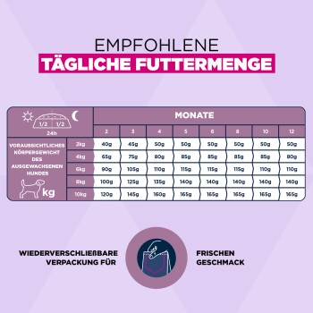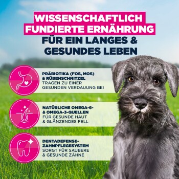 Die Ballaststoffmischung mit Präbiotika sorgt für eine gesunde Verdauung. Omega-6 und Omega-3 unterstützen gesunde Haut und glänzendes Fell. Die einzigartigen sechseckigen Kroketten und das DentaDefense-System halten die Zähne sauber. Dieses Futter unterstützt die optimale Körperkondition und das Wohlbefinden deines Welpen. Es ist ohne den Zusatz von künstlichen Farb- und Aromastoffen oder GVO formuliert.