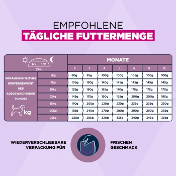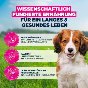 Dank DHA wird die Lernfähigkeit deines Welpen gestärkt. Kalzium fördert starke Knochen, und die Kombination aus Lamm und Huhn hilft beim Muskelaufbau. Die sechseckigen Kroketten reinigen die Zähne in Kombination mit dem DentaDefense-Zahnpflegesystem. Omega-6- und Omega-3-Fettsäuren pflegen die Haut und sorgen für glänzendes Fell. Antioxidantien stärken das Immunsystem, was dein Welpe schätzen wird. Diese fortschrittliche Ernährung ist zu 100% vollwertig und ausgewogen. EUKANUBA hilft deinem Welpen, gesund und vital aufzuwachsen.
