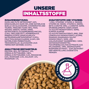 Die Ballaststoffmischung mit Präbiotikum FOS und Rübenschnitzeln fördert die Verdauung. Omega-6- und Omega-3-Fettsäuren sorgen für ein glänzendes Fell. Der Antioxidans-Komplex mit Vitamin E kann das Immunsystem stärken. Einzigartige sechseckige Kroketten und das DentaDefense-System tragen zur Zahngesundheit bei. Dieses Futter bietet deinem Hund die fortschrittliche Ernährung, die er braucht.