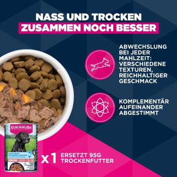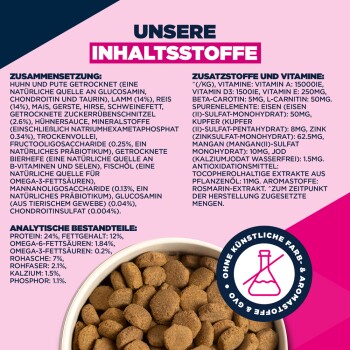 EUKANUBA Life Care mit Lamm und Reis ist ideal für ältere Hunde ab 6 Jahren. Es eignet sich besonders für empfindliche Mägen dank der leichten Verdaulichkeit von Reis. Die Rezeptur fördert gesunde Gelenke und starke Knochen, unterstützt durch Glucosamin und Chondroitin. Hochwertige Proteine aus Lamm und Huhn tragen zur Muskelentwicklung bei. Omega-Fettsäuren sorgen für ein glänzendes Fell, während Antioxidantien das Immunsystem stärken. Die einzigartige Krokettengröße und das DentaDefense-System pflegen die Zähne deines Hundes.