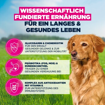EUKANUBA Life Care mit Huhn bietet deinem älteren Hund eine abgestimmte Ernährung. Es unterstützt das gesunde Altern und die Vitalität großer Rassen ab 9 Jahren. Die Rezeptur enthält L-Carnitin zur Gewichtskontrolle, während Glucosamin und Chondroitin die Gelenke unterstützen. Der Ballaststoffmix fördert eine gesunde Verdauung. Omega-Fettsäuren pflegen Haut und Fell, während Antioxidantien das Immunsystem stärken. EUKANUBA's DentaDefense-System hilft, die Zähne sauber zu halten. Dieses vollwertige Futter unterstützt die optimale Körperkondition deines Hundes.