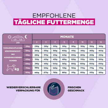 Mit EUKANUBA Life Care erhält dein Welpe ein wissenschaftlich fundiertes Premiumfutter, das auf die wechselnden Bedürfnisse großer Rassen im Alter von 1 bis 12 Monaten abgestimmt ist. Dieses Trockenfutter ist reich an frischem Huhn und bietet eine maßgeschneiderte Ernährung, um das Wachstum optimal zu unterstützen. DHA fördert die Lernfähigkeit, während Kalzium für starke Knochen sorgt. Der Komplex aus Antioxidantien mit Vitamin E stärkt das Immunsystem, und die Ballaststoffmischung unterstützt eine gesunde Verdauung.