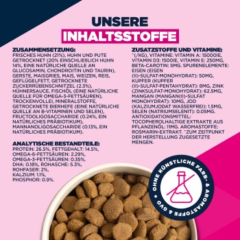 - Pflegt Haut und Fell mit Omega-6/-3