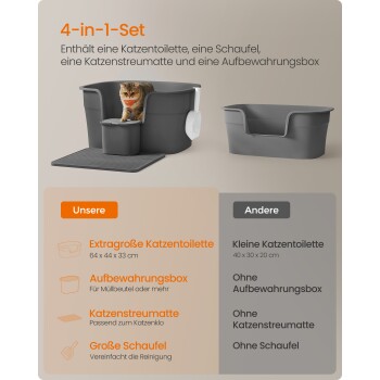 【4-IN-1-SET】Alles in einem: 1 Katzentoilette, 1 Schaufel, 1 Katzenstreumatte und 1 Aufbewahrungsbox für Müllbeutel. Die Streumatte fängt die Streu auf, die Aufbewahrungsbox hält die Beutel griffbereit und die Schaufel erleichtert die Reinigung
