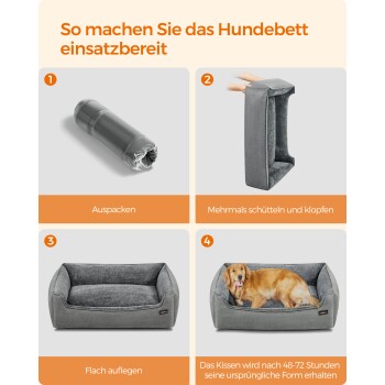 Dieses Hundesofa wird in einer Vakuumverpackung geliefert. Bitte schütteln Sie es nach dem Auspacken und lassen Sie es 48-72 Stunden stehen, damit es seine vollständige Größe erreicht.