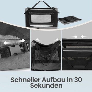 In nur 30 Sekunden ohne Werkzeug einsatzbereit und genauso schnell wieder flach zusammengefaltet – diese Transportbox ist der ideale Begleiter für unterwegs. Die Netztüren sorgen für viel Frischluft, während das kuschelige Fleece-Kissen Ihrem Hund einen gemütlichen Rückzugsort bietet. Der stabile Stahlrahmen in Kombination mit strapazierfähigem Oxford-Gewebe garantiert eine hohe Formstabilität, ergänzt durch sichere Reißverschlüsse und reflektierende Elemente für bessere Sichtbarkeit. Das Material lässt sich mühelos reinigen, das Fleece-Kissen kann herausgenommen werden und ein praktisches Seitenfach bietet Platz für Leine, Leckerlis & Co.