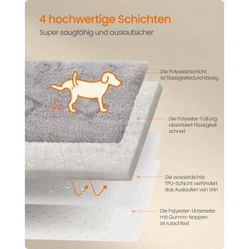 Gönnen Sie Ihrem Haustier den Luxus unserer waschbaren Welpenuterlagen mit 4 Schutzschichten. Diese Unterlagen leiten Flüssigkeiten schnell ab, saugen sie effizient auf und sind wasserdicht, so dass Flüssigkeit nicht ausläuft und eine trockene Umgebung für Ihren vierbeinigen Freund bietet.