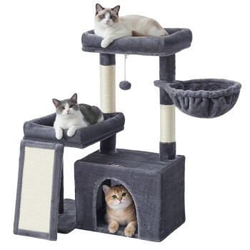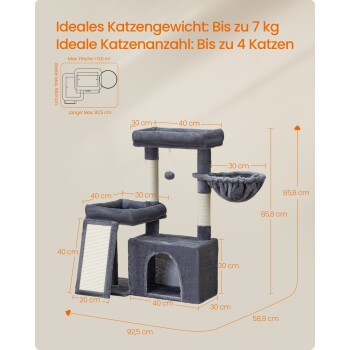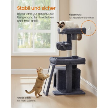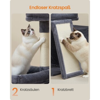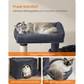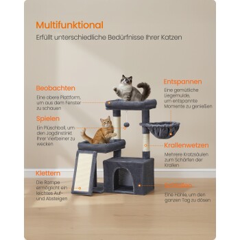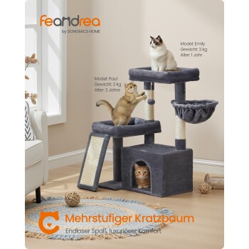 FEANDREA Katzenkratzbaum mit Höhle, Rampe und Körbchen, 2 große Plattformen dunkelgrau