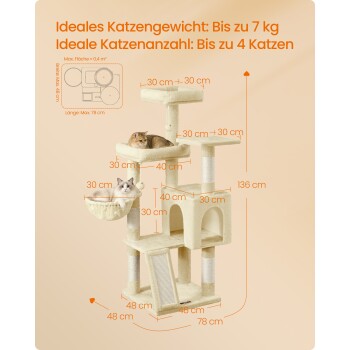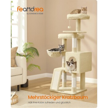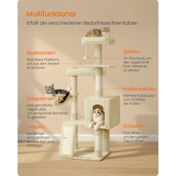 FEANDREA Kletterbaum mehrstufig, mit Rampe, Kratzsäulen, 3 Plattformen,136 cm beige