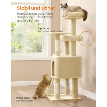 Robust und langlebig: Die 48 x 48 cm große, breite Basis und der Kippschutz sorgen für hervorragende Stabilität und Sicherheit. Dank der soliden Konstruktion trägt dieser Katzenbaum bis zu 60 kg – so kann Ihre Katze unbesorgt spielen und toben
